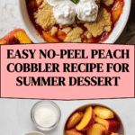 The image shows a white rectangular dish filled with a peach cobbler. The bottom layer is made of cooked peach slices in a syrupy red-orange sauce. The top layer is a golden-brown, crumbly biscuit crust broken in places, revealing the peach filling underneath. On one side of the cobbler, there are seven dollops of white whipped cream arranged in a small cluster with green mint leaves in the center. Two silver spoons rest inside the dish on the right side. The dish sits on a white marbled surface surrounded by whole peaches, a small white bowl with brown sugar, and a beige cloth napkin. photo taken with an iphone --ar 4:5 --v 7