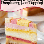 This Battenberg Cheesecake combines the rich, creamy texture of a classic cheesecake with the colorful and charming patterned Battenberg cake topping. A crunchy digestive biscuit base supports a smooth, vanilla and almond-infused cream cheese filling swirled with pink and yellow layers, baked to perfection, then topped with raspberry jam and slices of traditional Battenberg cake for a visually stunning and delicious dessert perfect for special occasions.
