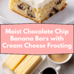 Deliciously moist and flavorful Chocolate Chip Banana Bars topped with a creamy cream cheese frosting. These bars combine the sweetness of ripe bananas with rich semi-sweet chocolate chips and a smooth, tangy frosting, perfect for dessert or a sweet snack.