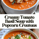 Creamy Tomato Basil Soup with Popcorn Croutons is a rich, velvety soup infused with fresh basil and topped with buttery popcorn croutons for a fun, crunchy twist. It’s a cozy, vegetarian-friendly dish perfect for weeknight dinners or as a unique starter.