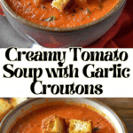 Creamy Tomato Soup with Garlic Croutons is a comforting classic made with rich tomatoes and smooth cream, topped with crispy, golden garlic croutons for the perfect texture contrast. Ideal for chilly days or cozy meals.