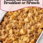 Sprinkle the crumble topping evenly over the soaked bread and bake your casserole uncovered for 50 to 60 minutes. The top should turn a lovely golden brown while the center sets. If it starts browning too quickly, simply cover it loosely with foil to prevent burning and ensure even cooking.