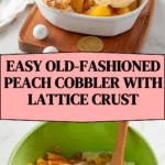 This easy old-fashioned peach cobbler recipe features a delightful lattice crust over a juicy, spiced peach filling. Perfectly balanced with cinnamon, cloves, and nutmeg, this classic dessert is baked to golden perfection and best enjoyed warm, optionally topped with vanilla ice cream or whipped cream.