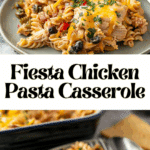 Fiesta Chicken Pasta Casserole is a hearty, Tex-Mex inspired dish packed with chicken, pasta, beans, veggies, creamy sauce, and melty cheese. It’s a one-dish wonder perfect for busy weeknights or potlucks.