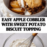 This Gooey Apple Cobbler with Sweet Potato Biscuits is a deliciously comforting dessert combining tender, spiced apples with sweet raisins and pecans, topped with fluffy, buttery sweet potato biscuits. Baked until golden and bubbling, it makes a perfect dish for fall gatherings or cozy evenings.
