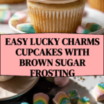 Lucky’s Golden Ticket Cupcakes are moist and fluffy vanilla cupcakes topped with a rich brown sugar buttercream frosting. Adorned with festive Lucky Charms marshmallows and edible gold leaf, these delightful treats are perfect for celebrations and bring a fun, magical touch to any occasion.