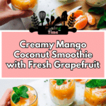 A refreshing and creamy Mango Coconut Milk smoothie featuring ripe mangoes blended with rich coconut milk and accented with tangy grapefruit segments, garnished with fresh mint leaves. Perfect as a quick, tropical-inspired snack or light dessert.