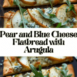 Pear and Blue Cheese Flatbread with Arugula is a crisp, elegant flatbread topped with sweet pears, tangy blue cheese, and peppery arugula, finished with a drizzle of honey or balsamic glaze. It’s perfect as a sophisticated appetizer, light main, or party snack.