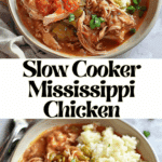 Slow Cooker Mississippi Chicken is a tender, juicy, and flavor-packed dish made with just a few pantry staples. This easy slow cooker recipe is perfect for busy nights, featuring shredded chicken smothered in ranch, au jus, and tangy pepperoncini peppers.