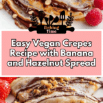Delicious and easy vegan crepes made with a smooth, lump-free batter of non-dairy milk and all-purpose flour, perfectly cooked on a nonstick pan. These crepes are filled with creamy hazelnut spread and fresh banana slices, making a delightful plant-based breakfast or dessert option that everyone will love.