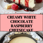 This White Chocolate Raspberry Cheesecake features a creamy and decadent filling made with melted white chocolate and swirled with fresh raspberry sauce, all resting on a rich chocolate cookie crust. Finished with fresh raspberries and white chocolate curls, it’s the perfect special-occasion dessert that combines tangy fruitiness with smooth sweetness and a crunchy base.